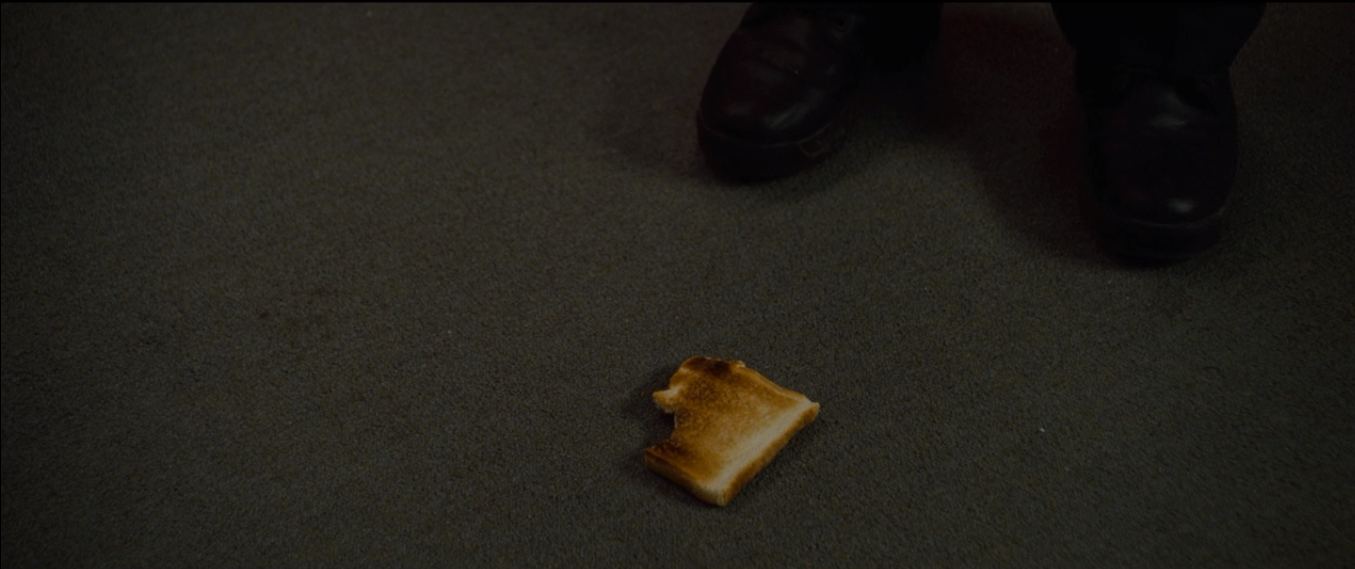 The two poor security guards on duty in the camera room work with the cops. One of them, a younger fella, is 100% convinced from the start that the devil is the killer in the elevator, because he read the script. Every other character is naturally skeptical. His response is a fool-proof test to determine the devil is near: he flips a nearby slice of toast, and it lands jelly-side down.